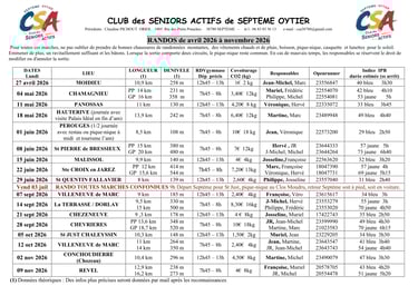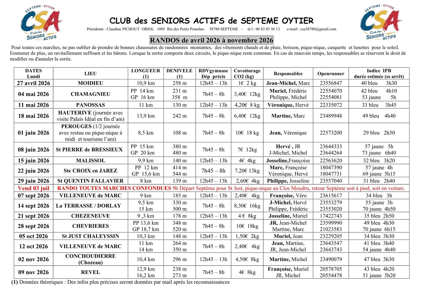Programme des randonnées du 3 novembre 2025 au 20 avril 2026.